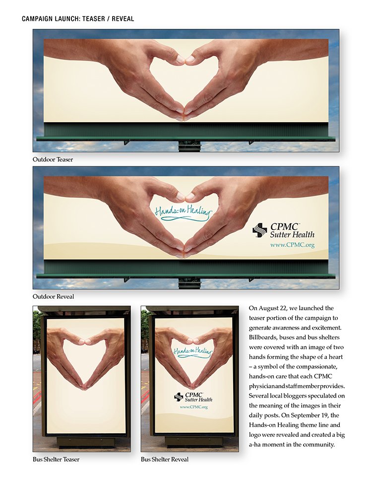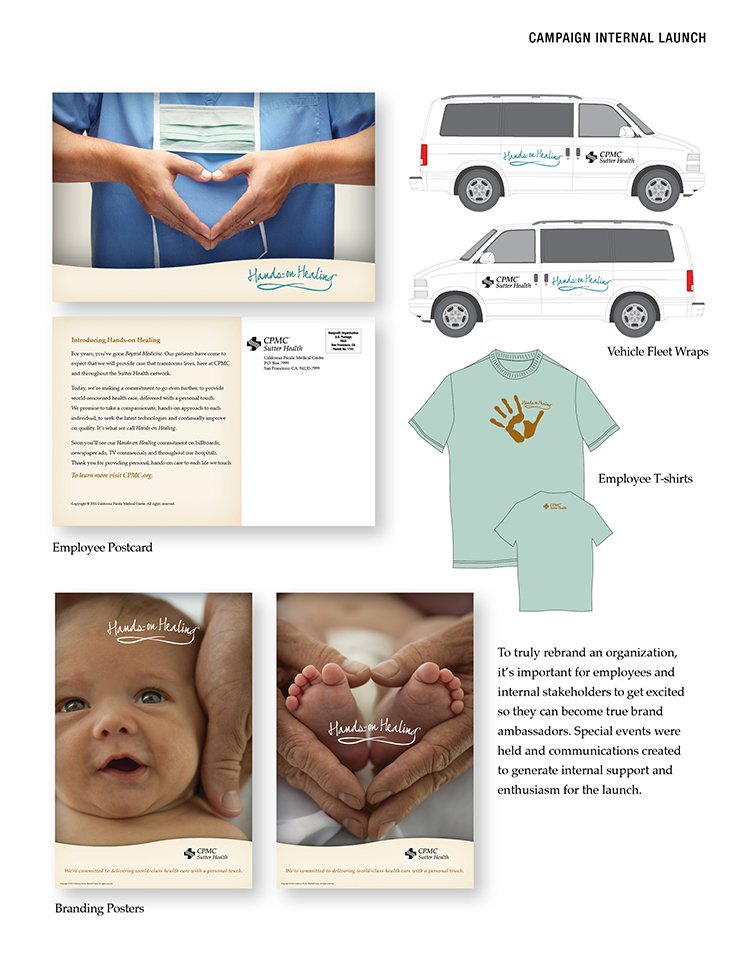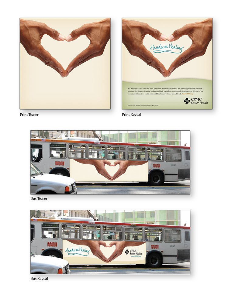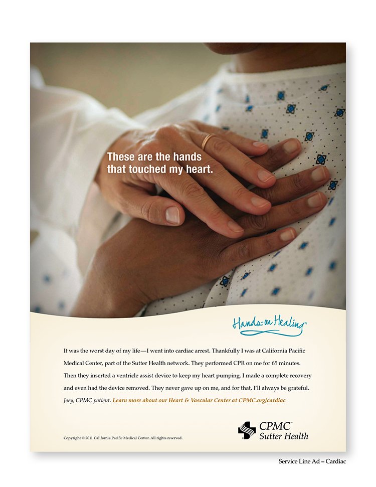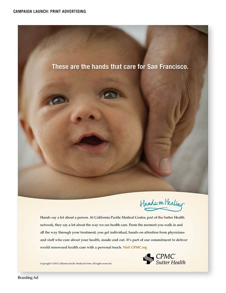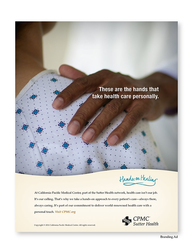 California Pacific Medical Center was experiencing aggressive competition from academic hospitals in the San Francisco area. This campaign shows renowned practitioners, not students, giving patients hands-on, personal care.